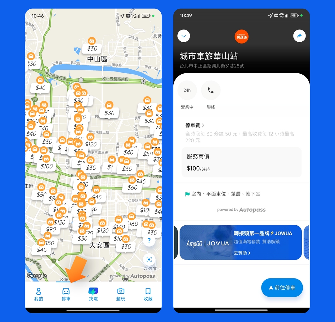 活動已結束雙平台停車支付 上線|綁定即送充電金2024/09/09 (一) 12:00 ~ 12/30 (一) 12:00 (UTC+8)全台灣 Autopass 停車場AmpGO 正式上線【停車支付功能】囉 🎉只要在AmpGO的APP綁定支付工具與車牌,【停車支付功能】就能讓車友們,免手動繳費,直接駛離停車場就會自動扣款囉‼️超級方便的功能,提前上架啦⚡️【停車支付|操作功能介紹】支援全台800個以上停車場,通過車牌識別 停車後直接離場 停車費自動扣款免去繳費機或是人工繳費!功能說明與操作介紹【停車支付|交易好禮】使用AmpGO、前往全台 Autopass 快速通支援之停車場消費,新戶現折最高折抵 40 元!!!首一筆停車場消費,現折 20 元,第二、三次皆可現折 10 元!活動時間:2024/9/9 - 2024/12/31【用戶交易好禮|活動規則】適用對象:未曾使用過 AmpGo 消費之電動車車牌皆可使用。優惠內容:首一筆停車場消費,現折 20 元,第二次和第三次停車場消費皆可現折 10 元。